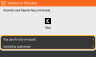 Om ett meddelande visas när enheten tar emot ett fax/I-fax eller automatiska rapportutskrifter har valts lagras mottagna fax/I-fax och rapporter i minnet för att undvika bleka utskrifter. Om du vill fortsätta att skriva ut trots att tonern börjar ta slut ställer du in <Forts. utskr. när patr. låg> på <På>. <Forts. utskr. när patr. låg> |