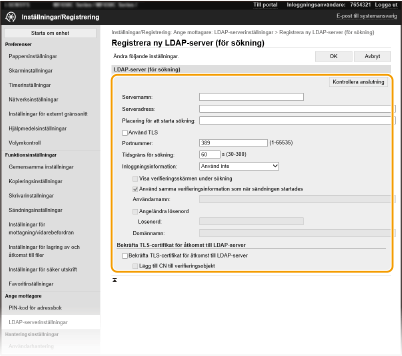 Registrering av LDAP-server behöver göras separat för sökning respektive autenticering. För att använda en LDAP-server för sökning efter fax- och e-postmottagare registrerar du den för sökning och för att använda den för autentisering vid sändning av e-post eller fax registrerar du den för autentisering.