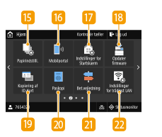 ![]() | <Papirindst.>Denne knap bruges til at angive størrelsen og typen af papir, der er lagt i papirskuffen og universalbakken. Angivelse af papirformat og –type <Mobilportal>Brug denne til at etablere en forbindelse til en mobil enhed. Forbindelse til mobilenheder <Indstillinger for Startskærm>Gør det muligt at ændre den rækkefølge, som Hjem-skærmknapperne vises i. Tilpasning af Hjem-skærmen <Opdater firmware>Gør det muligt at opdatere firmwaren via internettet. Opdatering af firmware <Kopiering af ID-Kort>Brug denne funktion til at kopiere for- og bagsiden af et kørekort eller et andet kort over på den samme side af et ark papir. Kopiering af id-kort <Paskopi>Giver dig mulighed for at kopiere flere pas ét ark. Fremstilling af kopier af pas <Betjeningsvejledning>Tryk her for at få hjælp til betjening og fejlårsager/-løsninger. <Indstillinger for trådløst LAN>Brug denne knap til at konfigurere indstillingerne for trådløst LAN. Oprettelse af forbindelse til trådløst LAN |