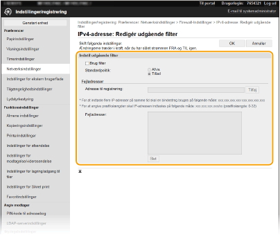 Når [Afvis] er valgt for udgående filter Udgående multicast- og broadcast-pakker kan ikke filtreres. Sletning af en IP-adresse fra undtagelser Vælg en IP-adresse, og klik på [Slet]. |