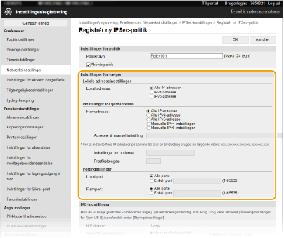 Vælgeren definerer betingelserne for IP-pakker for at anvende IPSec-kommunikation. De indstillinger, der kan vælges, omfatter maskinens IP-adresser og portnumre og de enheder, der skal kommunikeres med.