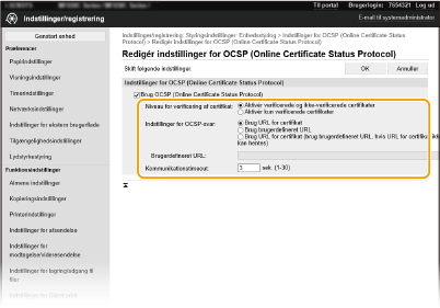 Du kan få bekræftet, om det certifikat, du har modtaget fra den anden part under kommunikationen, er gyldig ved at sende en forespørgsel til OCSP (online-certifikatstatusprotokol ). Konfigurér niveauet for verificering af certifikat og den OCSP-respondent, der skal oprettes forbindelse til. Disse skal registreres af administratoren.
