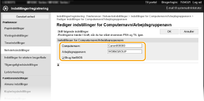 Et arbejdsgruppenavn er et navn til gruppering af flere computere, så de grundlæggende netværksfunktioner som f.eks. fildeling bliver tilgængelige på et Windows-netværk. Angiv de alfanumeriske tegn for navnet på den arbejdsgruppe, som maskinen tilhører.