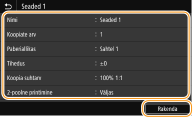Salvestatud sätted jäävad alles ka seadme väljalülitamisel. Kui soovite mõne salvestatud sätte kustutada, valige <Koopia>  <Muud seaded>  <Lemmikseaded>  valige sätted ja valige <Kustuta>  <Jah>. |