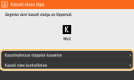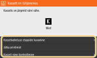 Kui faksi/i-faksi vastuvõtmise ajal või automaatse aruande väljastamise korral kuvatakse teade, salvestatakse vastuvõetud faksid/i-faksid ja aruanded mällu, et need poleks väljaprintimisel tuhmid. Printimise jätkamiseks ka siis, kui toonerikassett hakkab tühjaks saama, määrake sätte <Jätka print. tühja kassetiga> olekuks <Sees>. <Jätka print. tühja kassetiga> |