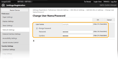 3 | Määrake kasutajanimi/parool. [User Name] Sisestage kasutajanimi (tähed ja/või numbrid). [Change Password] Parooli määramiseks või muutmiseks märkige ruut ja sisestage tekstiväljadele [Password] ja [Confirm] uus tähtedest ja numbritest koosnev parool. |