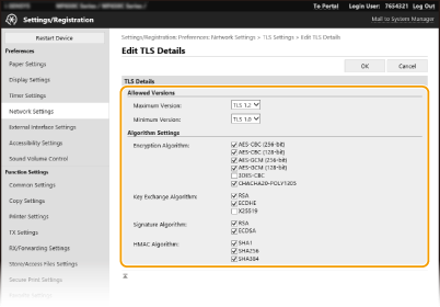 Juhtpaneeli kasutamineSaate lubada või keelata ka TLS-i krüptitud ühenduse menüüst <Menüü> kuval Avamenüü. <Kaugkasutajaliides> Remote UI (Kaugkasutajaliidese) käivitamine TLS-i abilKui proovite käivitada Remote UI (Kaugkasutajaliides) siis, kui TLS on lubatud, võidakse kuvada turbesertifikaati puudutav turbehoiatus. Sel juhul kontrollige, kas aadressiväljale on sisestatud õige URL, ja jätkake Remote UI (Kaugkasutajaliides) kuva kuvamisega. Tarkvara Remote UI (Kaugkasutajaliides) käivitamine TLS-i kasutamine e-posti/i-Faksi side krüptimiseksKui SMTP-server ja POP3-server toetavad TLS-i, saate nende serverite vahelise suhtluse jaoks lubada TLS-i (E-posti/I-faksi sätete konfigureerimine). SMTP-serveri ja POP3-serveri kohta saate lisateavet oma Interneti-teenuse pakkujalt või võrguadministraatorilt. |