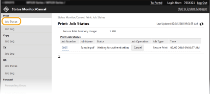 Sõltumata osakonna ID halduse seadest kuvatakse loendis kõik praegu prinditavad ja printimise ootel dokumendid. Kui sisestasite üldkasutaja režiimis sisselogimisel oma kasutajanime, kuvatakse teie kasutajanimi ainult prinditavatel dokumentidel. Klõpsake üksikasjaliku teabe kuvamiseks peatatud ja turvalistel dokumentidel nuppu [Job Number]. Saate kontrollida prinditud dokumentide kasutajanime ja lehekülgede arvu. |