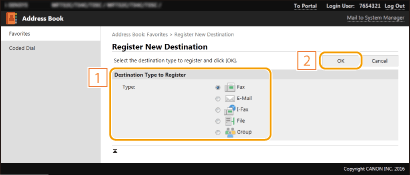 Valige registreeritava sihtkoha tüüp ja klõpsake [OK].