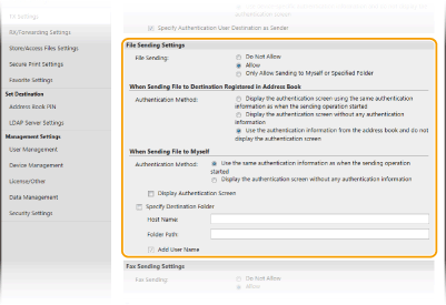 Kui olek [Only Allow Sending to Myself or Specified Folder] on määratud suvandis [File Sending]