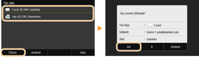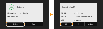 Kui soovite saatmise kohe pärast <Alusta> valimist tühistada, valige näidikul <Tühista> või vajutage klahvi . Dokumentide saatmise saate tühistada ka pärast dokumendi oleku vaatamist.