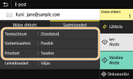 ![]() | Skannitud dokumentide e-kirjale lisamisel saate enne kirja saatmist määrata teema ja sisestada sõnumi teksti, vastamisaadressi ja meilisõnumi prioriteedi. |