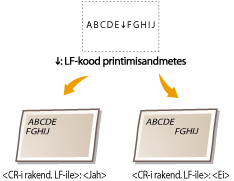 Saate määrata, kas reavahetuskoodi (LF) vastuvõtmisel rakendatakse prindipea tagasijooks (CR). Kui valitud on väärtus <Jah>, siis liigub printimiskoht reavahetuskoodi vastuvõtmisel järgmise rea algusesse. Kui valitud on väärtus <Ei>, siis liigub printimiskoht reavahetuskoodi vastuvõtmisel järgmisele reale vahetult reavahetuskoodi alla.