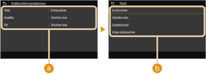 Tärnid (*)Olenevalt teie kasutatavast mudelist, valikutest või muudest seadetest ei pruugita märgiga „*1” tähistatud seadeid kuvada. Märgiga „*2” tähistatud seadeid ei saa importida ega eksportida. Seadete prioriteetKui printeri sätted on täpsustatud nii printeri draiverist kui seadme juhpaneelilt, siis printeri draiveri sätted on need mida arvestatakse eelistatuna. Juhtpaneeli seaded rakenduvad ainult teatud juhtudel, näiteks PS/PCL-printimise ja UNIX-i või mõne muu, printeridraivereid mittetoetava operatsioonisüsteemi kaudu printimise korral. |