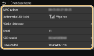 IP-aadress on valesti konfigureeritud, kui see kuvatakse järgmiselt: „0.0.0.0”. Seadme ühendamine võrgujaoturi või silla külge võib lõppeda ühenduse katkemisega isegi siis, kui IP-aadress on õigesti konfigureeritud. Selle probleemi lahenduseks on määrata kindel ajavahemik enne ühenduse loomise algust. Võrguga ühenduse loomise ooteaja määramine Saate printida praeguste võrguseadete loendi. Kasutajaandmete loend / süsteemihalduriandmete loend |