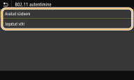 2 | Valige autentimisviis. ![]() <Avatud süsteem> Määrab avatud süsteemi autentimise, mida kutsutakse ka avatud autentimiseks. <Jagatud võti> Paroolina kasutatakse krüptimisvõtit. ![]() Kui on valitud <Avatud süsteem> Traadita side kohtvõrguga ühenduse loomisel ilmneb seadmes autentimistõrge, kui traadita side marsruuterile on määratud jagatud võtme autentimine. Sel juhul muudab seade automaatseks sätteks <Jagatud võti> ja proovib ühenduse taasluua. |