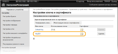 Ключ и сертификат невозможно удалить, если они в настоящее время используются в каких-либо целях, например, если в разделе [Использование ключа] отображается "[TLS]" или "[IEEE 802.1X]". В этом случае отключите функцию или замените ключ и сертификат перед их удалением.