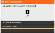 Kdy se má zpráva zobrazitPro zbývající množství toneru v tonerových kazetách (v procentech), které aktivuje zprávu, můžete nastavit jakoukoli hodnotu. <Zobr. čas pro přípravu kaz.>