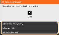 Pokud se zobrazí zpráva, když zařízení přijímá fax/I-fax, nebo pokud je nastaven automatický výstup hlášení, pak se přijaté faxy/I-faxy a hlášení místo vytištění uloží do paměti, aby po vytisknutí nevypadaly vybledlé. Pokud chcete pokračovat v tisku, přestože dochází toner, nastavte funkci <Pokr. v tisku. s polopr. kaz.> na <Zapnuto>. <Pokr. v tisku. s polopr. kaz.>