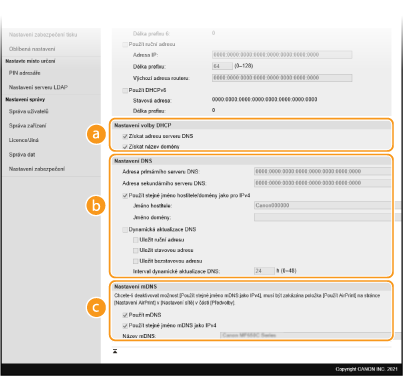 mDNS (multicast DNS) je protokol přijatý službou Bonjour, který slouží k přiřazení názvu hostitele k adrese IP bez použití systému DNS. Pokud chcete povolit protokol mDNS, zaškrtněte toto políčko. [Použít stejné jméno mDNS jako IPv4]