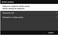 Jeśli <Ekran po podł. noś. pam.> ustawiony jest na <Włącz>, dostępne działania są wyświetlane gdy wkładasz urządzenie pamięci masowej USB podczas wyświetlania ekranu Główny. <Ekran po podł. noś. pam.>
