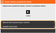 Jako wartość wywołującą wyświetlenie komunikatu można ustawić dowolną wartość procentową ilości toneru pozostałego w kasecie z tonerem. <Wyśw.czas koniecz. przyg.kas.>