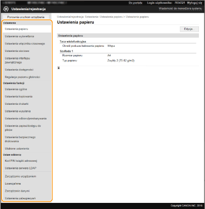 Za pomocą Zdalnego interfejsu użytkownika można zmieniać różne ustawienia urządzenia. Większość ustawień można konfigurować także w urządzeniu, ale niektóre z nich mogą zostać zmienione tylko za pomocą Zdalnego interfejsu użytkownika. W tej części opisano podstawowy przebieg procedury modyfikacji ustawień urządzenia przy użyciu Zdalnego interfejsu użytkownika.