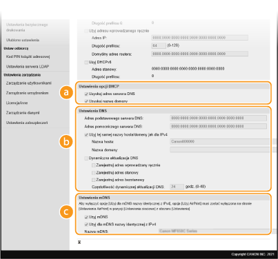 To pole wyboru należy zaznaczyć w celu korzystania z takiej samej nazwy mDNS jak w przypadku protokołu IPv4. Aby ustalić inną nazwę, należy usunąć zaznaczenie tego pola i wprowadzić nazwę mDNS w polu tekstowym [Nazwa mDNS]. |