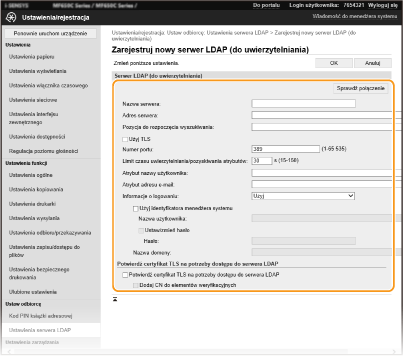Jeśli w sieci wdrożono serwer LDAP, można wyszukiwać na nim numery faksów oraz adresy e-mail, a następnie określać je jako odbiorców lub rejestrować je w książce adresowej. W przypadki włączenia uwierzytelniania funkcji wysyłania ( Uwierzytelnianie serwera LDAP) należy zarejestrować serwer używany do uwierzytelniania. Do urządzenia można zarejestrować maksymalnie po pięć serwerów LDAP do wyszukiwania i do uwierzytalniania. Do rejestracji serwera LDAP należy użyć Zdalnego interfejsu użytkownika.
