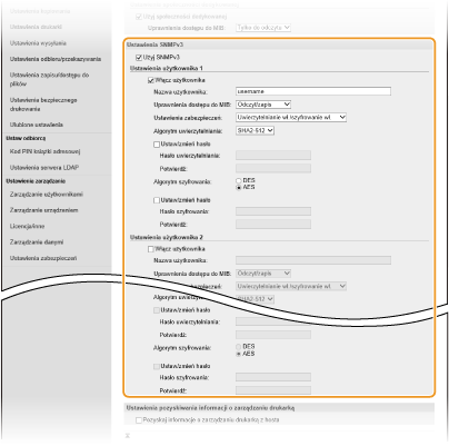 Jeśli włączone są obie wersje protokołu SNMP, zalecane jest wybranie w ustawieniach uprawnień dostępu do obiektów menedżera MIB dla protokołu SNMPv1 opcji [Tylko do odczytu]. Uprawnienia dostępu do obiektów menedżera MIB dla protokołów SNMPv1 i SNMPv3 można ustalać oddzielnie (a także osobno dla każdego użytkownika w przypadku protokołu SNMPv3). Wybranie opcji [Odczyt/zapis] (uprawnienie pełnego dostępu) dla protokołu SNMPv1 anuluje wydajne funkcje zabezpieczeń protokołu SNMPv3, ponieważ większością ustawień urządzenia można wtedy zarządzać za pomocą protokołu SNMPv1.