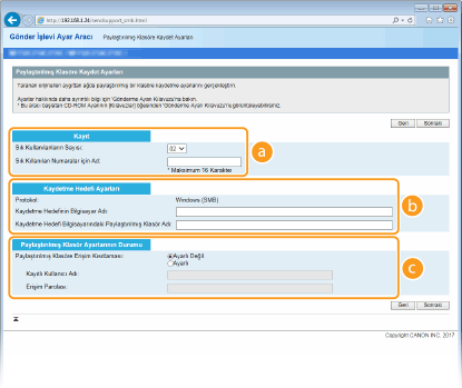 Klasörü Adres Defterine kaydederek, kaydetme hedefi olarak paylaşılan klasörün konumunu belirtmek için Uzak Kullanıcı Arabirimini de kullanabilirsiniz. Uzak Kullanıcı Arabiriminden Adres Defterindeki Hedefleri Kaydetme. Uzak Kullanıcı Arabiriminden Hedefleri Kaydetme