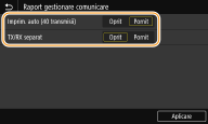 Selectaţi <Pornit> pentru a imprima separat rapoartele de trimitere şi primire sau <Oprit> pentru a imprima ambele rapoarte pe o singură foaie.