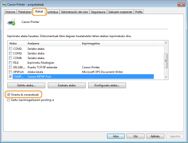 Hautatutako atakei [Description] [Canon MFNP Port] bada eta makina eta ordenagailua azpisare berean badaude, konexioa mantendu egingo da. Ez duzu ataka berririk gehitu behar. [Standard TCP/IP Port] bada, ataka berri bat gehitu behar duzu. Inprimagailuaren atakak konfiguratzea