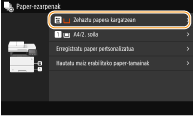 Paper-ezarpen lehenetsia erregistratu ondoren, papera kargatzean ez da paper-ezarpenen pantaila bistaratuko eta beti ezarpen bera erabiliko da. Paper-ezarpenak aldatu gabe beste paper-tamaina edo mota bat erabiltzen baduzu, baliteke makinak behar bezala ez inprimatzea. Arazo hau saihesteko, hautatu <Zehaztu papera kargatzean> 3. urratsean eta ondoren kargatu papera.