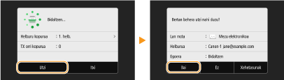 Dokumentuen bidalketa <Hasi>, sakatu bezain pronto ezeztatu nahi baduzu, hautatu <Utzi> pantailan edo sakatu . Dokumentuen bidalketaren egoera begiratu ondoren ere ezeztatzeko aukera duzu.