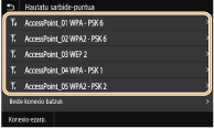 Konexiorako erabilgarri dauden hari gabeko routerrak (edo sarbide-puntuak) bila ditzakezu eta ondoren bat hautatu makinaren pantailan bistaratzen direnen artean. Sare-gakorako, sartu enkriptatze-gakoa/pasahitza. Hari gabeko router bat hautatu baino lehen, begiratu eta idatzi beharrezko konfigurazio-informazioa, SSID eta sare-kodea barne (
