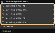 Si la conexión inalámbrica se configura seleccionando un router inalámbrico, el método de autenticación WEP se establece en <Sistema abierto> o el método de cifrado WPA/WPA2 se establece en <Auto> (AES-CCMP o TKIP). Si desea seleccionar <Clave compartida> en la autenticación WEP o <AES-CCMP> en el cifrado WPA/WPA2, debe configurar la conexión en <Introduzca el nombre de red a mano (SSID)>. Configuración de la conexión especificando las opciones detalladas