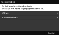 Wenn <Bildschirm bei Verb. Speicherm.> auf <Ein> gesetzt ist, werden die verfügbaren Aktionen angezeigt, sobald Sie ein USB-Speichergerät bei angezeigtem Bildschirm Startseite anschließen. <Bildschirm bei Verb. Speicherm.> ![]() Da im Schlafmodus möglicherweise keine Bildschirme angezeigt werden, beenden Sie den Schlafmodus, bevor Sie ein USB-Speichergerät einsetzen. |