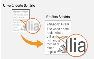 | | Sie können die Schärfe des Bildes anpassen. Erhöhen Sie die Schärfe, um unscharfen Text und Linien schärfer darzustellen, oder verringern Sie die Schärfe, um die Darstellung von Zeitschriftenfotos zu verbessern. Justieren der Schärfe |