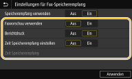 <Faxvorschau verwenden>Legen Sie fest, ob eine Vorschau der im Speicher abgelegten Empfangsdokumente möglich sein soll. Wählen Sie <Ein>, um die Dokumente über Remote UI in der Vorschau anzuzeigen.