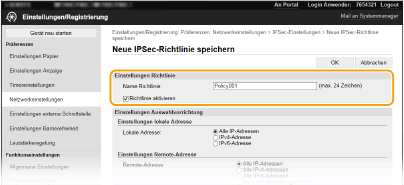 Wenn das Gerät nur Pakete empfangen soll, die einer der in den Schritten unten festgelegten Sicherheitsrichtlinien entsprechen, deaktivieren Sie das Kontrollkästchen [Empf. von Pak. ohne Richtlinie].