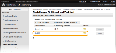 Klicken Sie auf [Schlüsselname] oder [Zertifikat], um das Zertifikat zu registrieren.