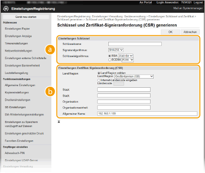 Da die am Gerät generierten Zertifikate über keine CA-Signatur verfügen, kann je nach den Geräten, mit denen es kommuniziert, ein Kommunikationsfehler auftreten. Damit die Zertifizierungsstelle das Zertifikat mit der CA-Signatur ausstellen kann, müssen Sie Daten von CSR (Zertifikats-Signieranforderung) anfordern, die der Administrator über Remote UI generieren kann. Sobald das Zertifikat ausgestellt ist, registrieren Sie es in dem über CSR generierten Schlüssel.