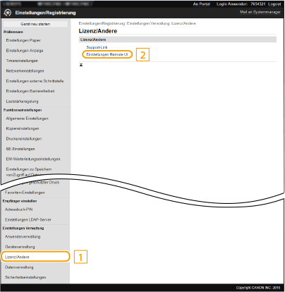 Weitere Informationen über die Grundfunktionen, die bei der Konfiguration des Geräts über die Remote UI auszuführen sind, finden Sie unter Einstellen von Menüoptionen über Remote UI. |