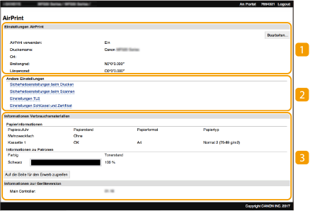 Rufen Sie den Bildschirm für AirPrint auf, auf dem Sie nicht nur auf die AirPrint-Einstellungen zugreifen, sondern auch Informationen zu Verbrauchsmaterial wie Papier und Tonerpatrone anzeigen können. Darüber hinaus können Sie die Einstellungen der Sicherheitsfunktion konfigurieren.