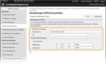 Ermöglicht Ihnen die Überprüfung der in den AirPrint Einstellungen eingegebenen Werte, wie beispielsweise Name und Standort des Geräts. Sie können auf [Bearbeiten] klicken, um die Einstellungen zu ändern.