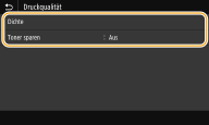 <Druckqualität> Sie können die Einstellungen in Bezug auf die Druckqualität ändern. ![]() <Dichte> Stellt die Helligkeit für den Druck ein. <Toner sparen> Bei Auswahl von <Ein> erfolgt der Druck im Tonersparmodus. Wählen Sie <Ein>, wenn Sie das Layout oder andere Erscheinungsmerkmale überprüfen möchten, bevor Sie mit dem eigentlichen Druck eines großen Auftrags beginnen. ![]() Wenn <Toner sparen> auf <Ein> gesetzt ist, steht <Dichte> nicht zur Verfügung. |