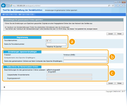 Mit dem Tool für die Einstellung der Sendefunktion können Sie einen gemeinsamen Ordner zum Speichern gescannter Dokumente unter <Favoriten> im Adressbuch speichern. Wählen Sie eine Nummer aus der Dropdown-Liste aus.
