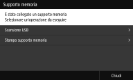 Se <Scherm. Con supp. mem. conn> è impostato su <On>, le azioni disponibili vengono visualizzate quando si inserisce un dispositivo di memoria USB mentre viene visualizzata la schermata Schermata princip.. <Scherm. Con supp. mem. conn> ![]() Poiché in modalità sospensione le schermate non vengono visualizzate, uscire dalla modalità sospensione prima di inserire un dispositivo di memoria USB. |