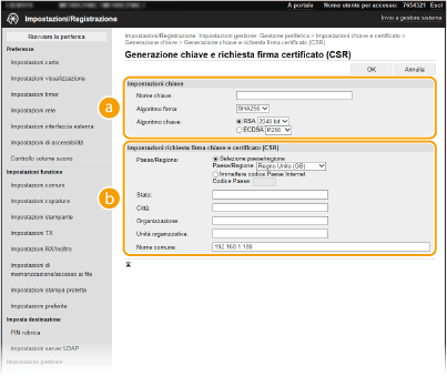 Poiché i certificati generati sulla macchina non hanno una firma CA, potrebbe verificarsi un errore di comunicazione in base ai dispositivi con cui comunica. Affinché l'autorità di certificazione emetta il certificato con la firma CA, è necessario ottenere i dati di CSR (Certificate Signing Request), che l'amministratore può generare dalla IU remota. Una volta emesso il certificato, registrarlo nella chiave con la CSR generata.